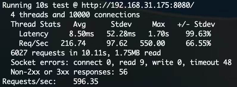下图展示的是一个基于 NetUtils 包搭建的 HTTP 服务器,在龙芯 3A4000 上运行的性能测试结果(使用 wrk 模拟一万并发请求):