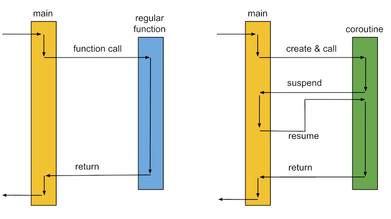 常规函数调用 vs. 协程上下文切换。协程可以认为是一种特殊的、轻量的“可重入”函数(图源网络)